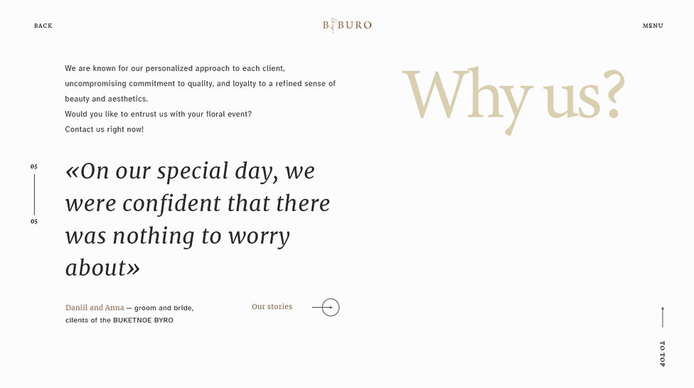 The boutique floristry studio is primarily focused on wedding aesthetics and decor. Therefore, when designing the website, it was essential to preserve a sense of air, lightness, and refinement.
